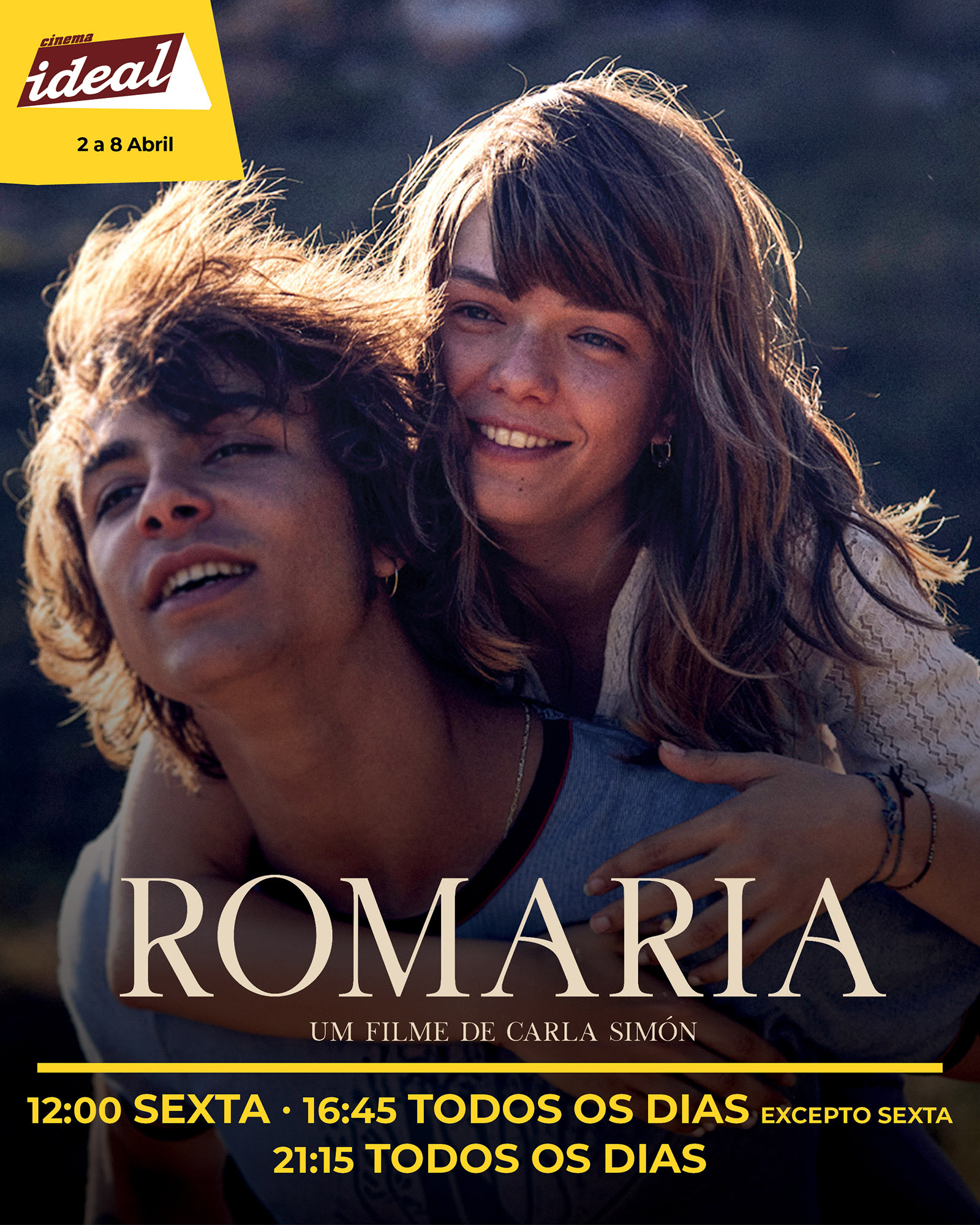 29.04.2026 16:30CinemaCinema Ideal29.04.2026 16:30[Cinema]RomariaMarina, de 18 anos, órfã desde pequena, tem de viajar até à costa atlântica de Espanha para...